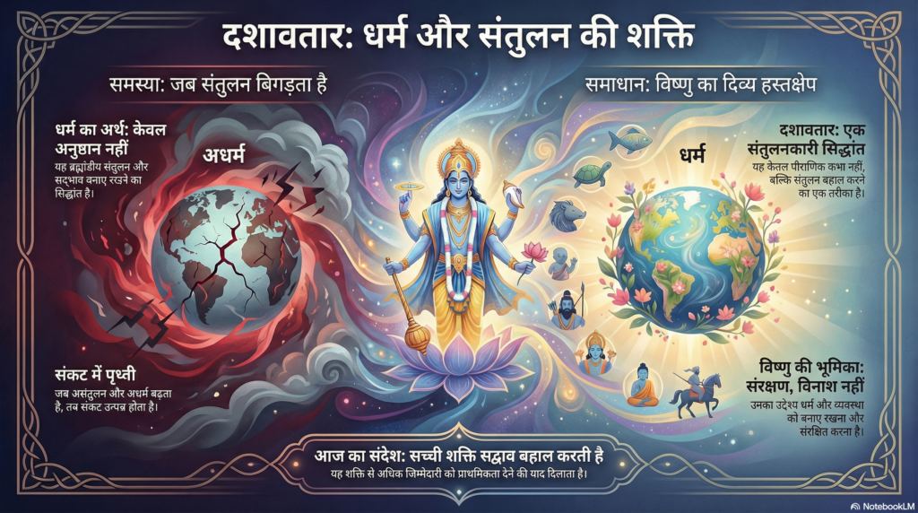 जब यह संतुलन टूटता है, तब दशावतार का सिद्धांत सक्रिय होता है।