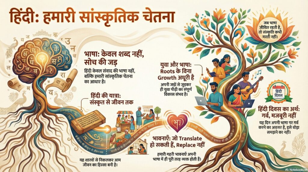 हिंदी दिवस explores language as cultural identity and living consciousness for today’s youth.